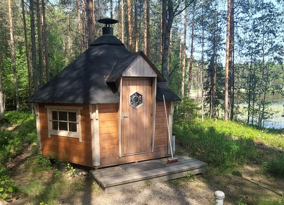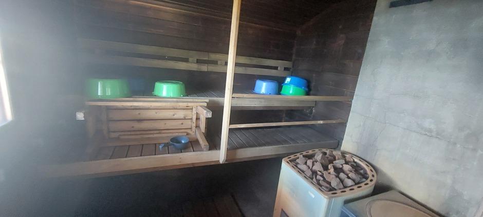 Mökin välittömässä läheisyydessä rannassa on palju ja erillinen saunarakennus, jossa on sauna, pukuhuone ja halkoliiteri. Kesällä saunaan tulee juokseva kylmä vesi kaivosta, talvella vesi on haettava järvestä. Saunassa on puulämmitteinen kiuas ja muuripata.